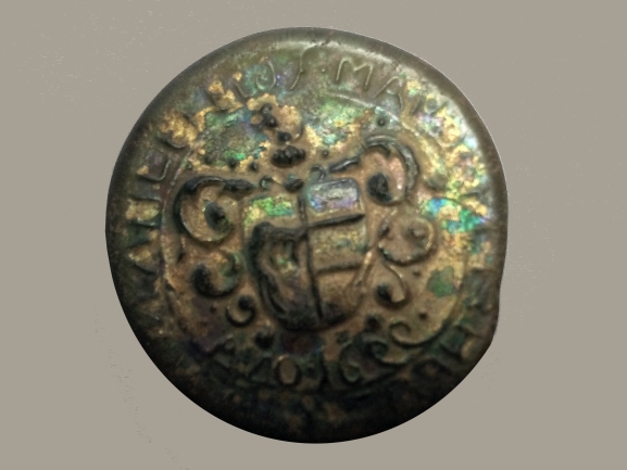 Object, ronde flesbodem of stempelafdruk met tekst van geïriseerd groen glas