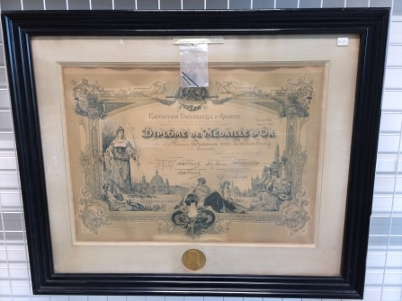 Ingelijste medaille en gravure, uit de collectie Draisma van Valkenburg te Leeuwarden betreffende levertraan productie