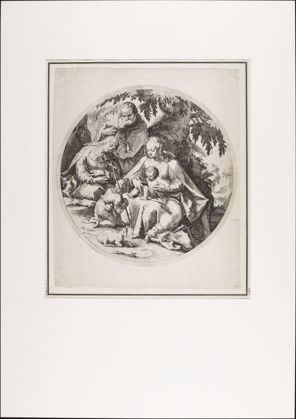 De heilige familie aan de voet van een boom met de heiligen Elizabeth en Johannes de Doper