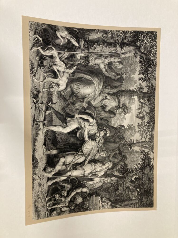 Afdruk (diepdruk) van een metalen plaat waarin met een burijn een voorstelling is gestoken. Onder druk verschijnt de ingepoetste inkt in de verdiepte lijnen als een voorstelling op het papier. Een gravure kan zijn ingekleurd nadat deze is gedrukt. https://data.cultureelerfgoed.nl/term/id/cht/0b751220-3066-47af-b136-3a7ecde465e4