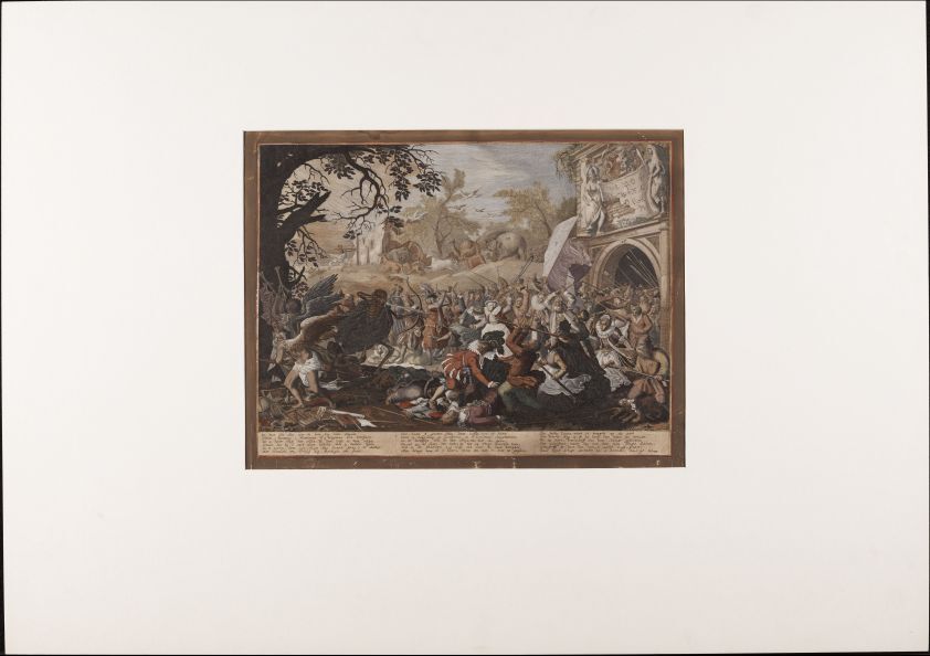 Afdruk (diepdruk) van een metalen plaat waarin met een burijn een voorstelling is gestoken. Onder druk verschijnt de ingepoetste inkt in de verdiepte lijnen als een voorstelling op het papier. Een gravure kan zijn ingekleurd nadat deze is gedrukt. https://data.cultureelerfgoed.nl/term/id/cht/0b751220-3066-47af-b136-3a7ecde465e4