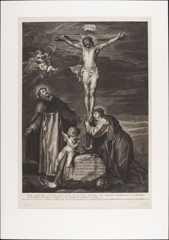 Christus aan het kruis met St. Dominicus en St. Catherina van Siena
