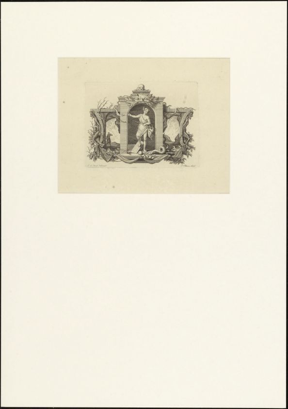 Cartouche met vrouw met ezelsoren staande op stenen tafelen met de 10 geboden