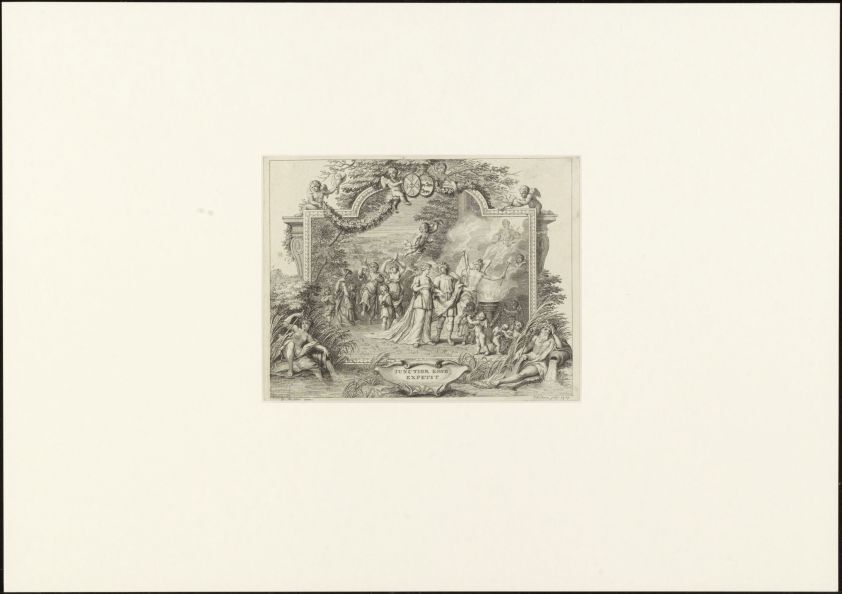 Allegorische voorstelling van het huwelijk met bovenin wapens