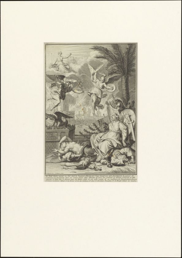 Judea gesymboliseerd door geboeide vrouw met op de achtergrond de brandende ->*