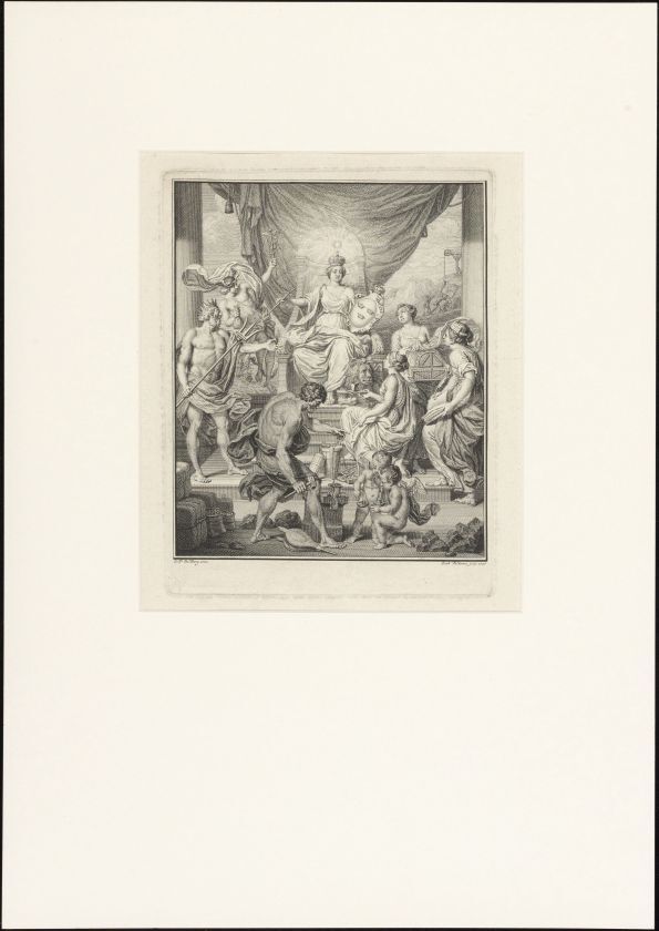 Vrouw op troon omringd door goden van handel en nijverheid