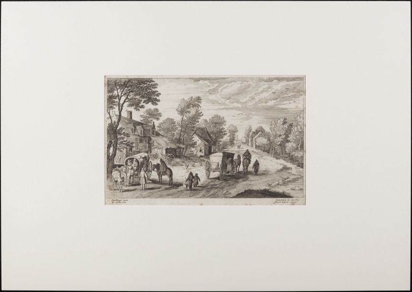 Dorpsgezicht met 2 rijtuigen