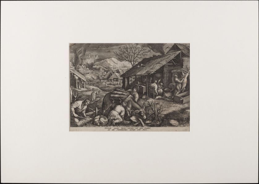 Winter, voorgesteld door landschap met boerderijen en diverse winterse aktiviteiten