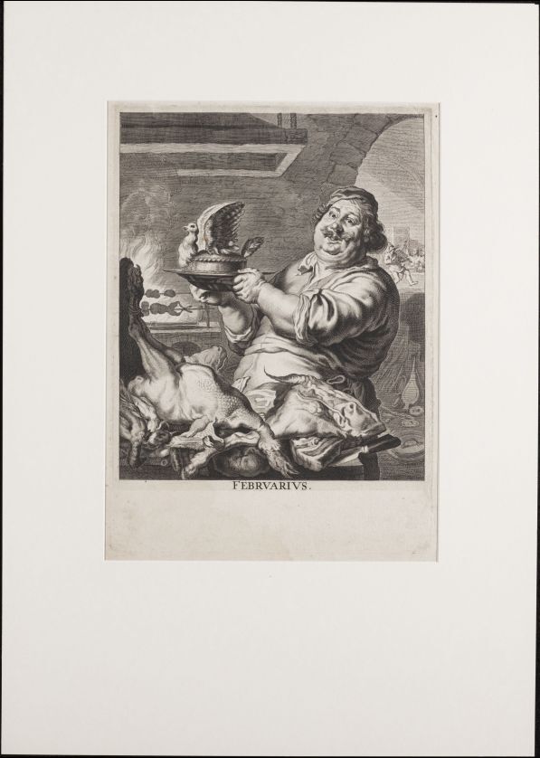 Man in keuken en met pastei in de hand, voorstellende februari