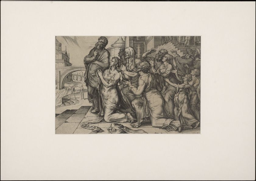 Noach (of Lot) kijkt met groep mensen naar overstroming