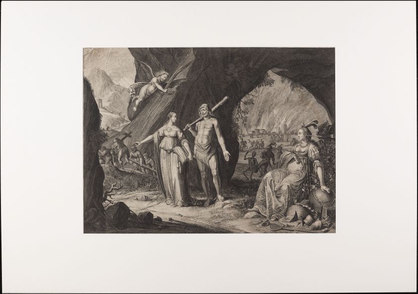 Afdruk (diepdruk) van een metalen plaat waarin met een burijn een voorstelling is gestoken. Onder druk verschijnt de ingepoetste inkt in de verdiepte lijnen als een voorstelling op het papier. Een gravure kan zijn ingekleurd nadat deze is gedrukt. https://data.cultureelerfgoed.nl/term/id/cht/0b751220-3066-47af-b136-3a7ecde465e4