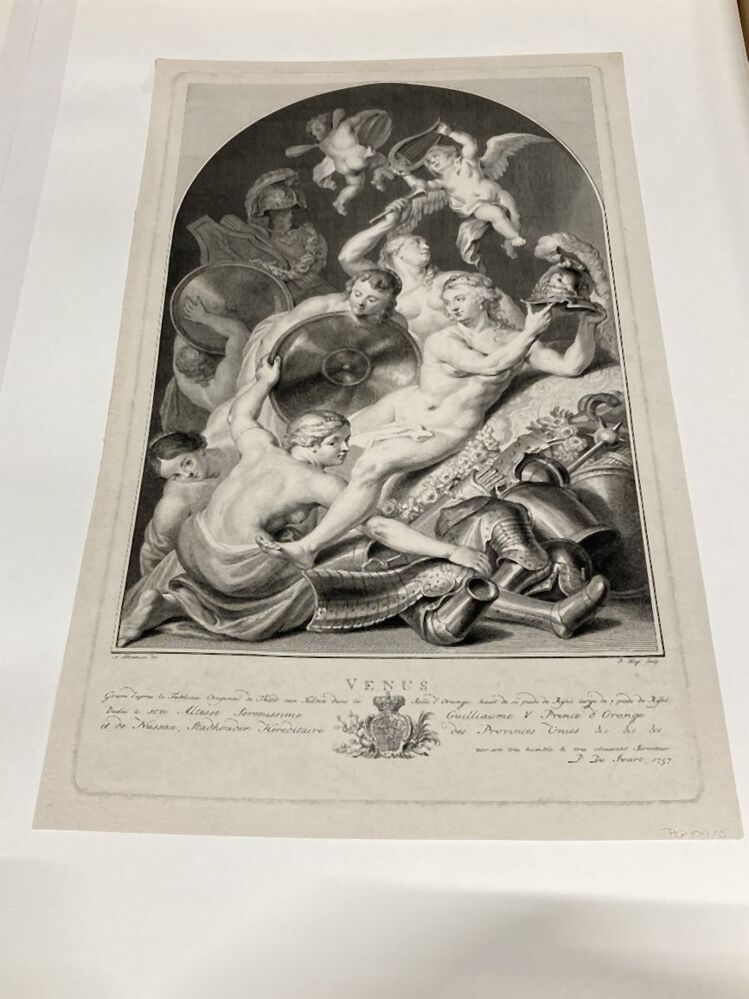 Afdruk (diepdruk) van een metalen plaat waarin met een burijn een voorstelling is gestoken. Onder druk verschijnt de ingepoetste inkt in de verdiepte lijnen als een voorstelling op het papier. Een gravure kan zijn ingekleurd nadat deze is gedrukt. https://data.cultureelerfgoed.nl/term/id/cht/0b751220-3066-47af-b136-3a7ecde465e4