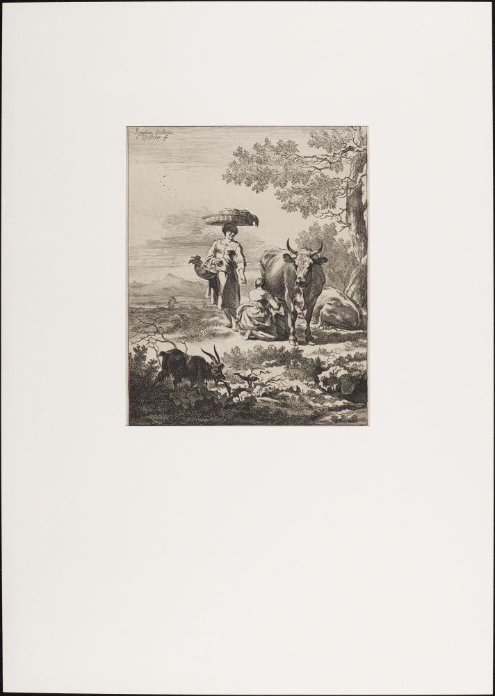 Landschap met vrouw, die koe melkt