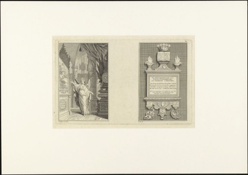 Twee afbeeldingen op één plaat: engel voor altaar en memorietafel voor->*