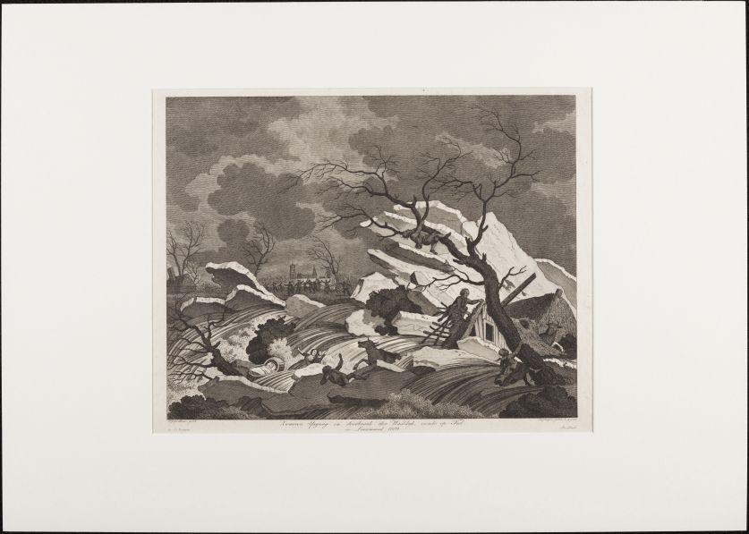 'Zwaaren Ysgang en doorbraak der Waaldijk, ziende op Tiel....1809'