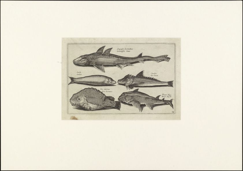 Vijf verschillende vissen o.a. steur, sardien en zeeleeuw