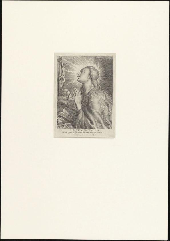 Maria Magdalena biddend voor kruisbeeld