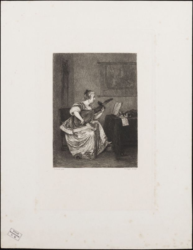 Vrouw bespeeld een luit en kijkt ondertussen naar het bladmuziek