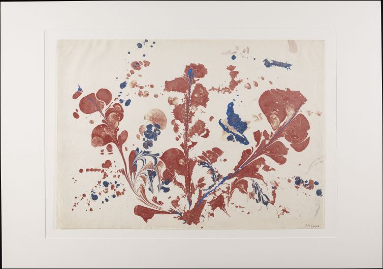 Blad met marmer in spatwerk- en kamwerktechniek, in rood en blauw