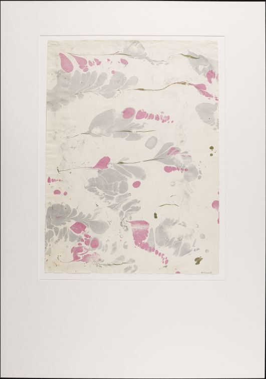 Blad met marmeren florale vormen in spatwerk- en kamwerktechniek, in groen, magenta en grijs
