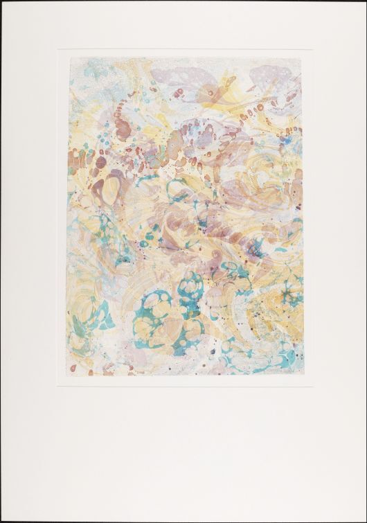 Blad met marmer in spatwerk-, kamwerk- en gedispergeerde techniek, in rood, purper, rose, geel, groen en blauw