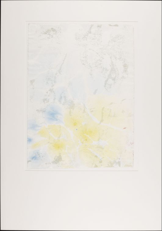 Blad met marmer in gedispergeerde techniek, in geel, groen, blauw en rood
