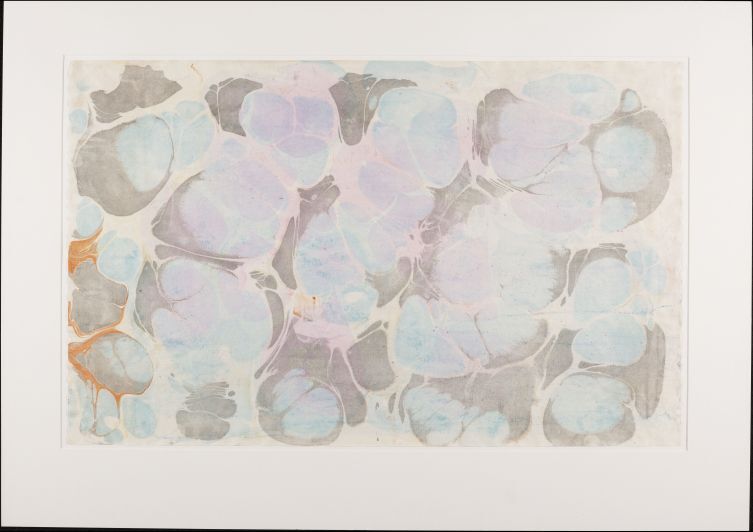 Blad met marmer in spatwerktechniek, in Portugees patroon, in purper, rose, blauw, grijs en oranje