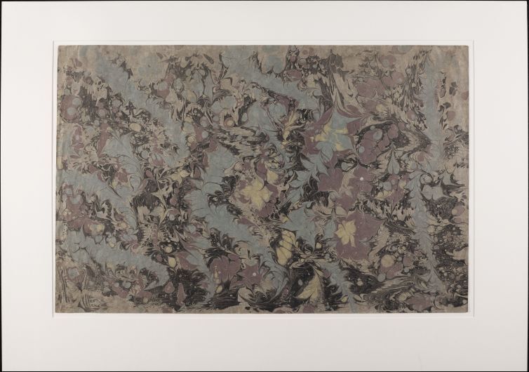 Blad, groengrijs geverfd, met marmer in kamwerk- en krultechniek, in groen, grijs, rood en geel