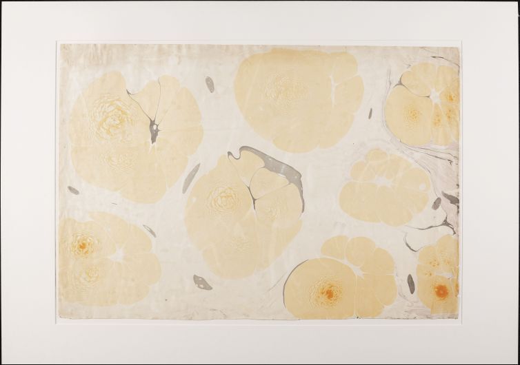 Blad met bakmarmer in spatwerk- en kamwerktechniek, in geel, grijs, rose en oranje