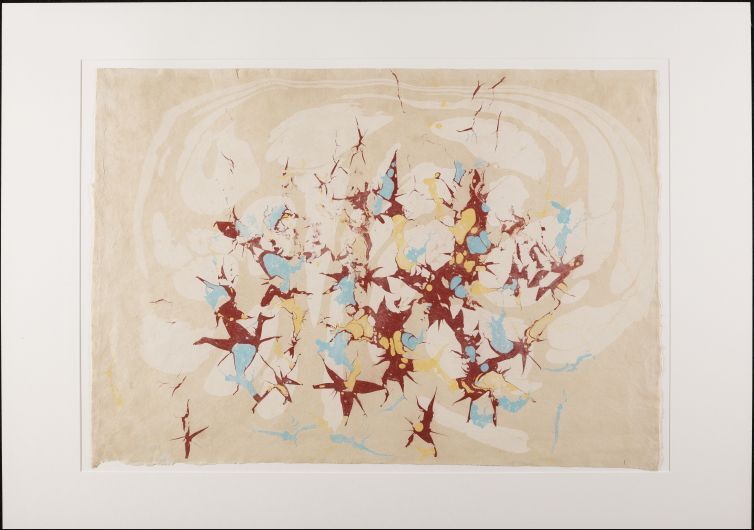 Blad met bakmarmer in spatwerk- en roertechniek, in rood, geel, blauw en wit