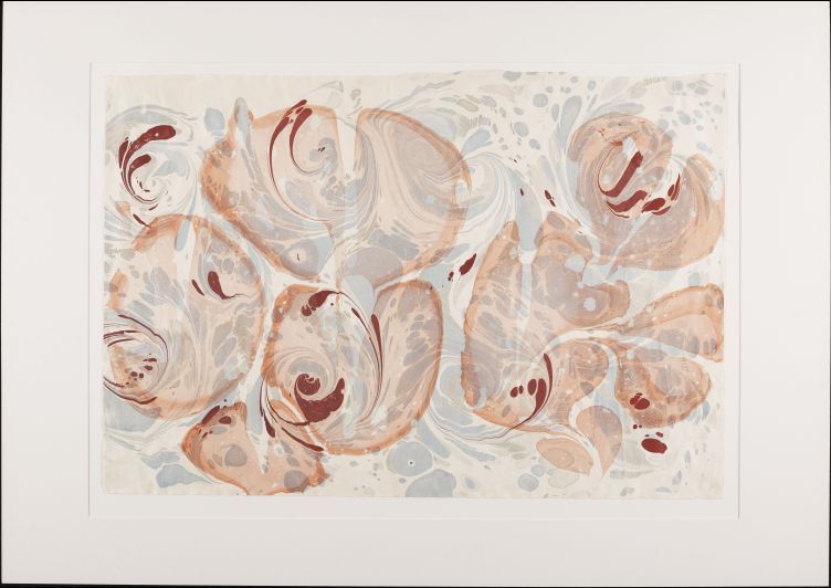 Blad met bakmarmer in spatwerk- en kamwerktechniek, in Stormontpatroon, in oranje, blauw, grijs en rood