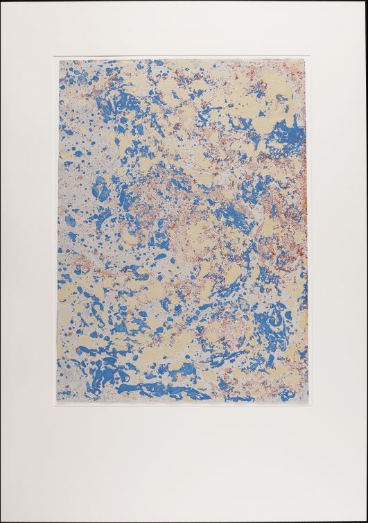 Blad grijs geverfd papier met marmer in kiezelstroommarmerpatroon, in blauw, geel en rood