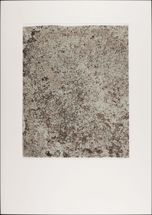 Blad, groen geverfd, met marmer in spatwerktechniek, in bruin, blauw, rood en oranje