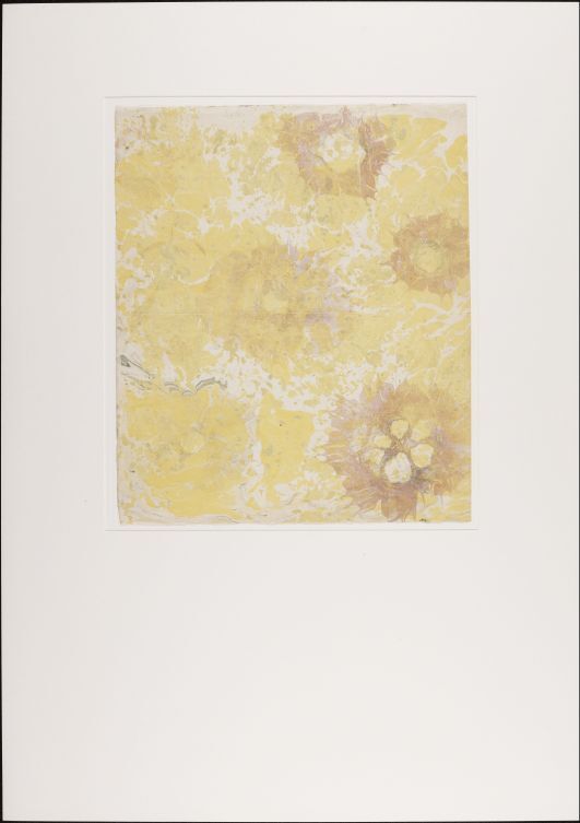 Blad met marmer in spatwerk- en kamwerktechniek, vermoedelijk in Placardpatroon, in geel, rood, grijs en geelgroen