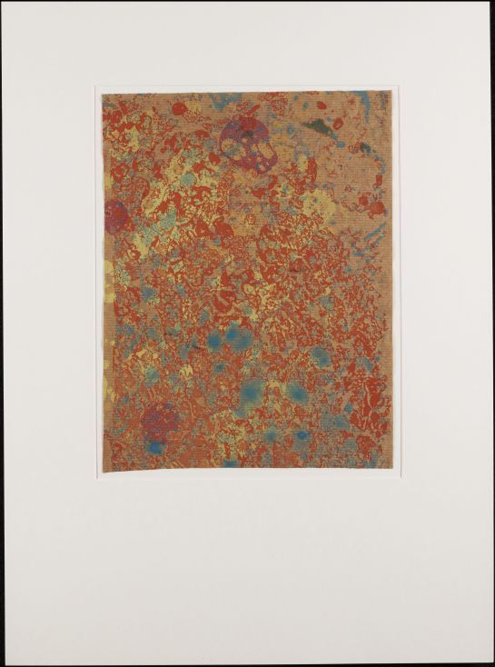 Blad bruin pakpapier met marmer in spatwerktechniek, in rood, geel, blauw en purper
