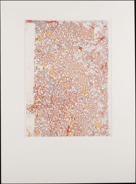 Blad met marmer in spatwerktechniek, in neo-Italiaans patroon, in rood, blauw en geel