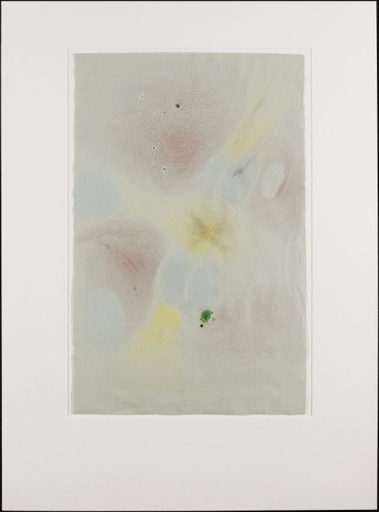 Blad, groen geverfd, met marmer in spatwerktechniek, in rood, blauw, geel, groen en goudpoeder