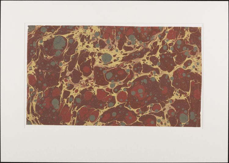 Blad met marmer in spatwerktechniek, in kiezelstroommarmerpatroon, in bruin, geel, groen en rood