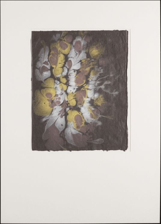 Blad, bruinviolet geverfd, met marmer in Italiaans patroon, in wit, geelgroen en rood