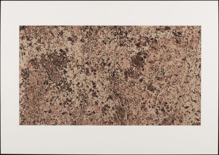 Blad met marmer in spatwerktechniek, in Gustav-patroon, in roodbruin, rood, blauw en geel