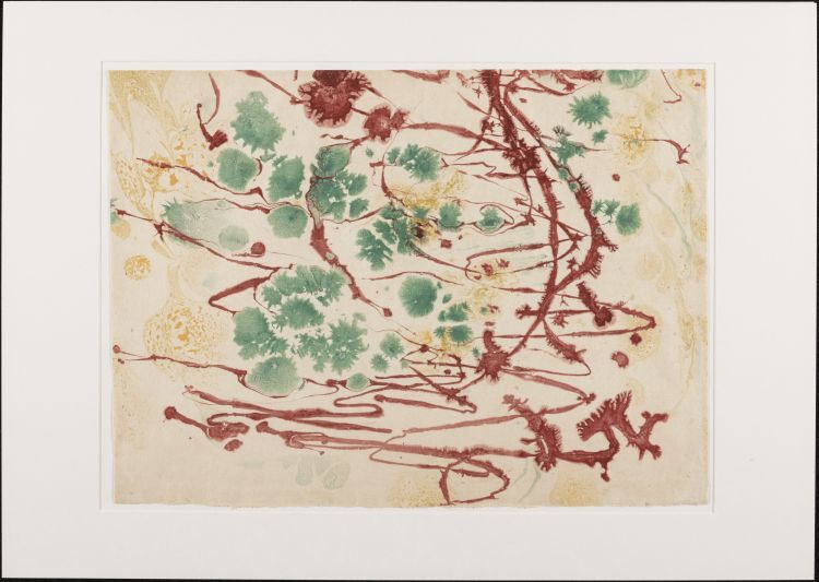 Blad met marmer in spatwerk- en roerwerktechniek, in rood, groen en geel