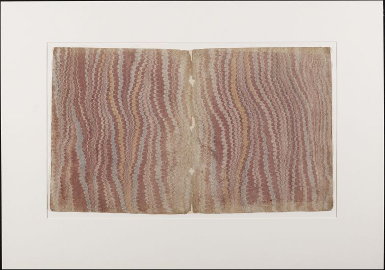 Blad met marmer in Hollands patroon, in rood, blauw en geel, oud boekomslag