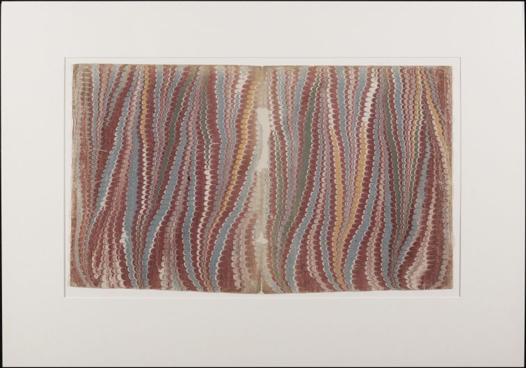 Blad met marmer in Hollands patroon, in rood, blauw, groen en geel, oud boekomslag