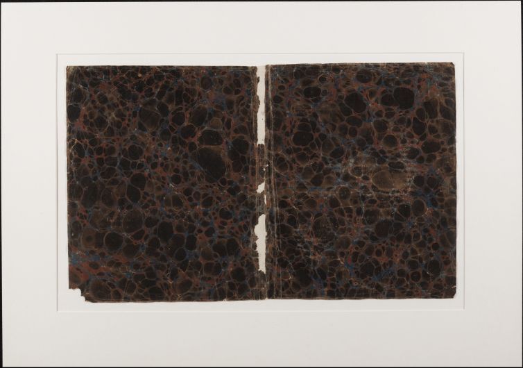 Blad met marmer in zebrapatroon, in bruin, rood en blauw, oud boekomslag