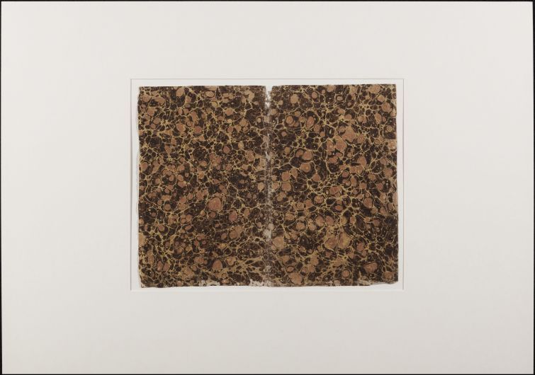 Blad met marmer in Frans schelppatroon, in bruin, rood en geel, oud boekomslag