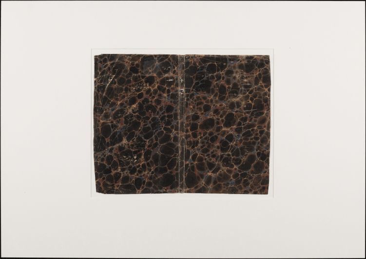 Blad met marmer in schelppatroon, in omber, blauw en creme, oud boekomslag