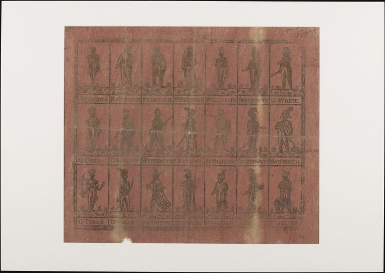 Blad rood geverfd brocaatpapier met afbeeldingen van vorsten en militairen