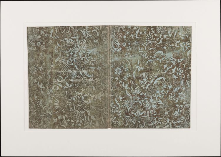 Blad groen geverfd brocaatpapier, met bloem- en fruitmotieven, oud boekomslag