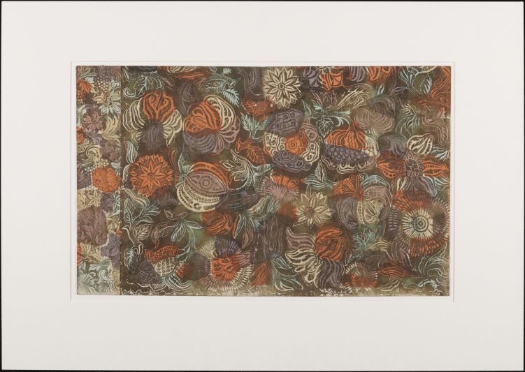 Blad veelkleurig geverfd brocaatpapier, met bloemmotieven, oud boekomslag