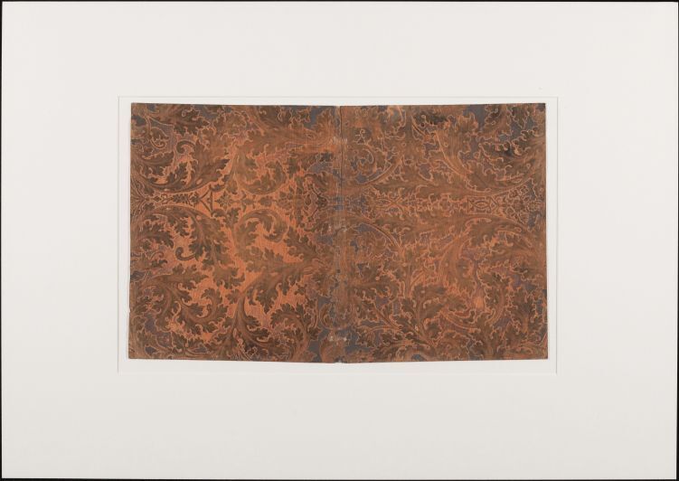 Blad oranje geverfd brocaatpapier met paarse vlekken, met blad- en bloemmotieven, oud boekomslag